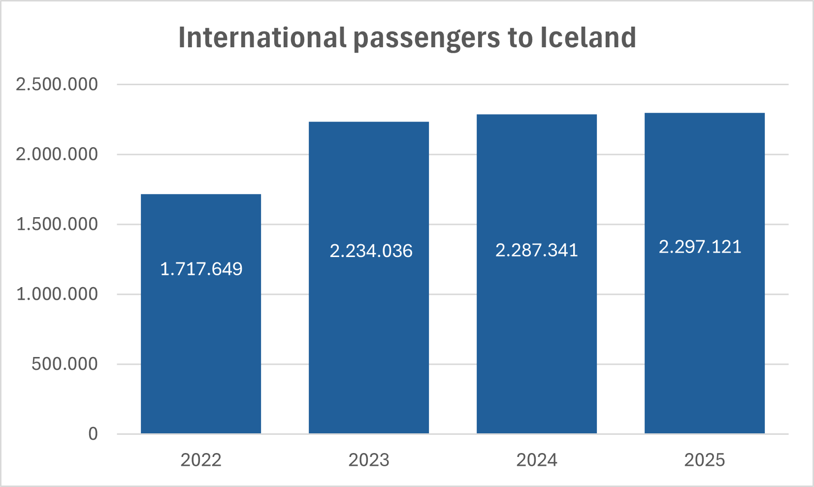 The estimated number for Akureyri international airport is 11.340 passengers for the year 2025. Figures for Reykjavík international airport are not available, but they do not weigh heavily on the whole, or less than 0.5% considering the last few years.