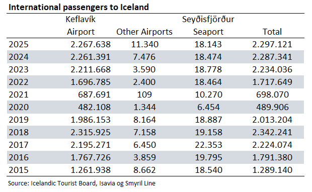 The total number of foreign overnight visitors to Iceland was just under 2.3 million in 2025. This can be seen in the table to the right, 2015-2024.