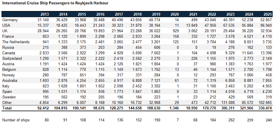 In addition, there are cruise ship passengers, but they are counted as day tourists and are not part of the numbers above. About 322 thousand cruise ship passengers arrived at the Port of Reykjavík in 2024. This is the largest number of passengers that have come to Reykjavík by cruise ship in one year, but previously the most number of passengers was 306 thousand in 2023.